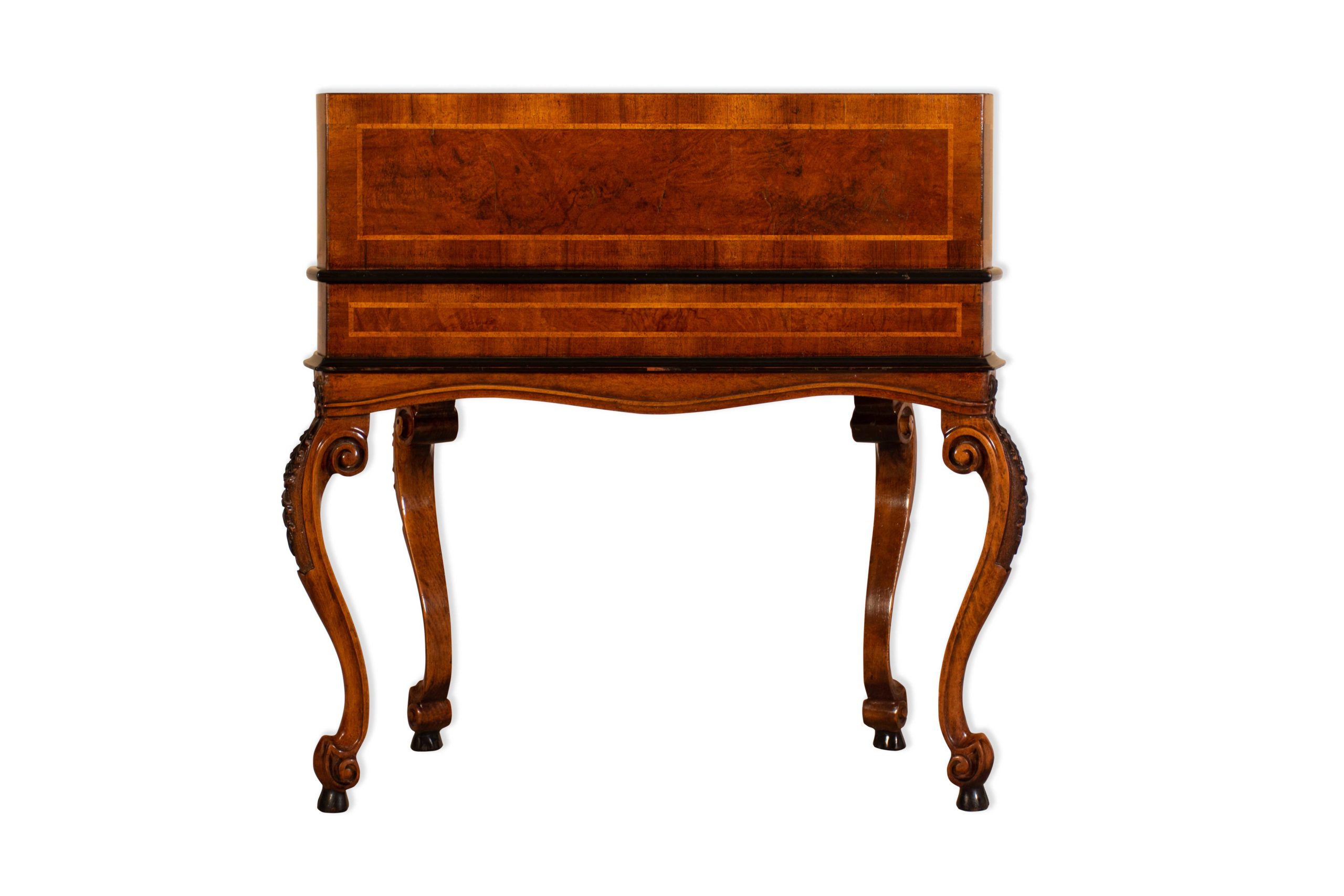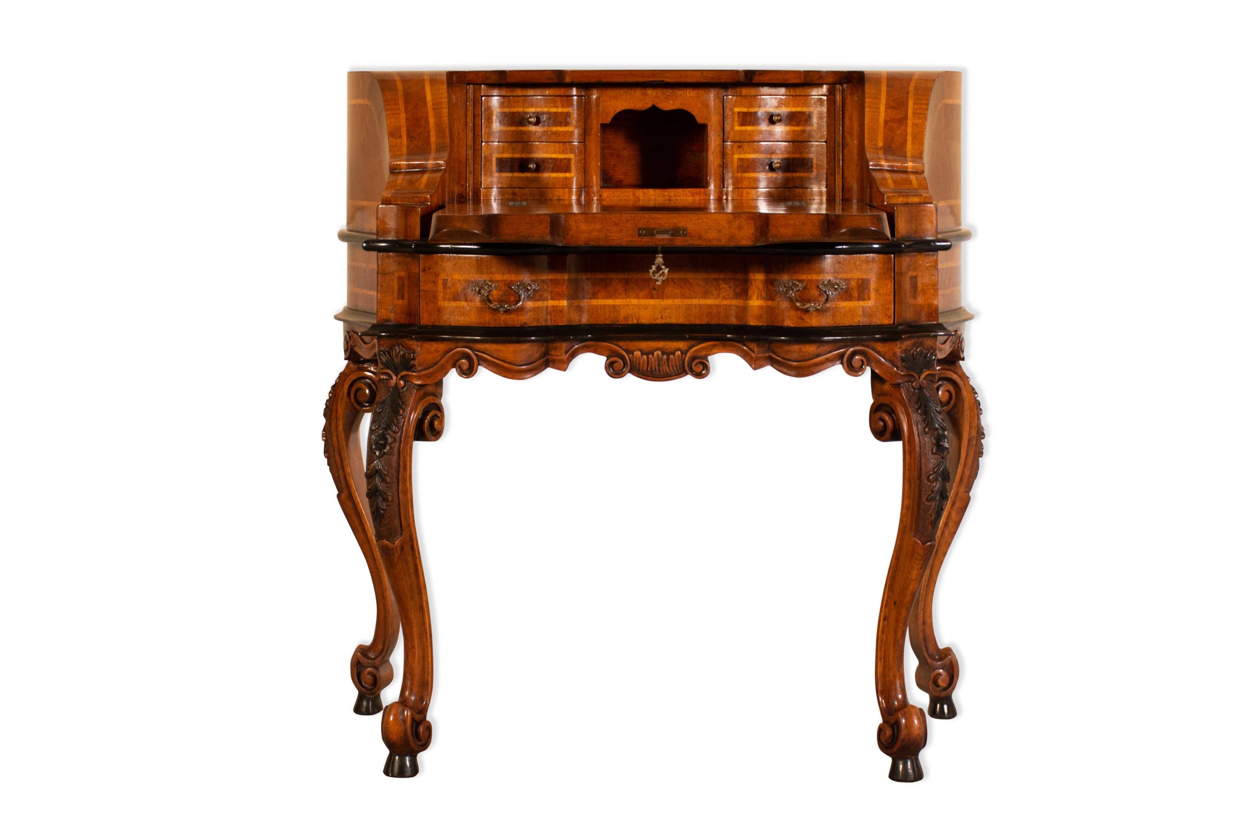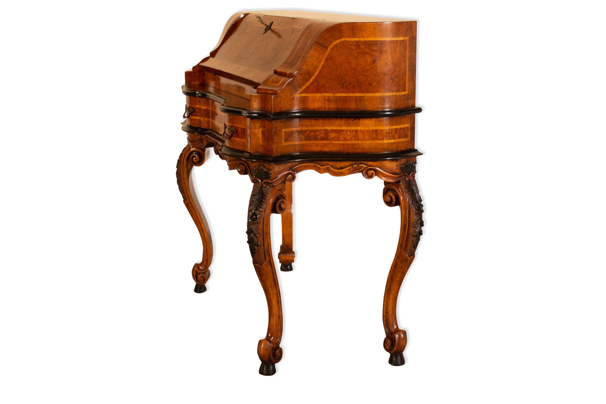 A pretty and elegant drop leaf desk in «Barocchetto» style, faithfully reproduced from the original dating back to the 1700s in Venice. The «Barocchetto» style is mostly Italian: it appeared during the first half of the XVIII century and became immediately popular throughout the Italian peninsula. This style represents the historical continuation of the rich exaggerated lines and voluminous forms of the previous Baroque style, but in a less imposing and above all more functional interpretation. This elegant desk for the centre of a room is supported by four tall, curved legs, adorned at the top with a flower and leaves carved by hand. The fact that this desk can be positioned in the centre of the room indicates that all four sides are designed and worked in detail to be seen and appreciated, so that it needs not be positioned against a wall. The base of the drop leaf is produced in solid spruce, veneered in chestnut briarwood, maple filleting, and a walnut interior, all with a thickness of 3 mm. The drop and the four legs are in lime wood. The drop leaf presents some profiles highlighted with the ebonizing technique that, upon request, will not be applied. Please feel free to contact us with your requests.